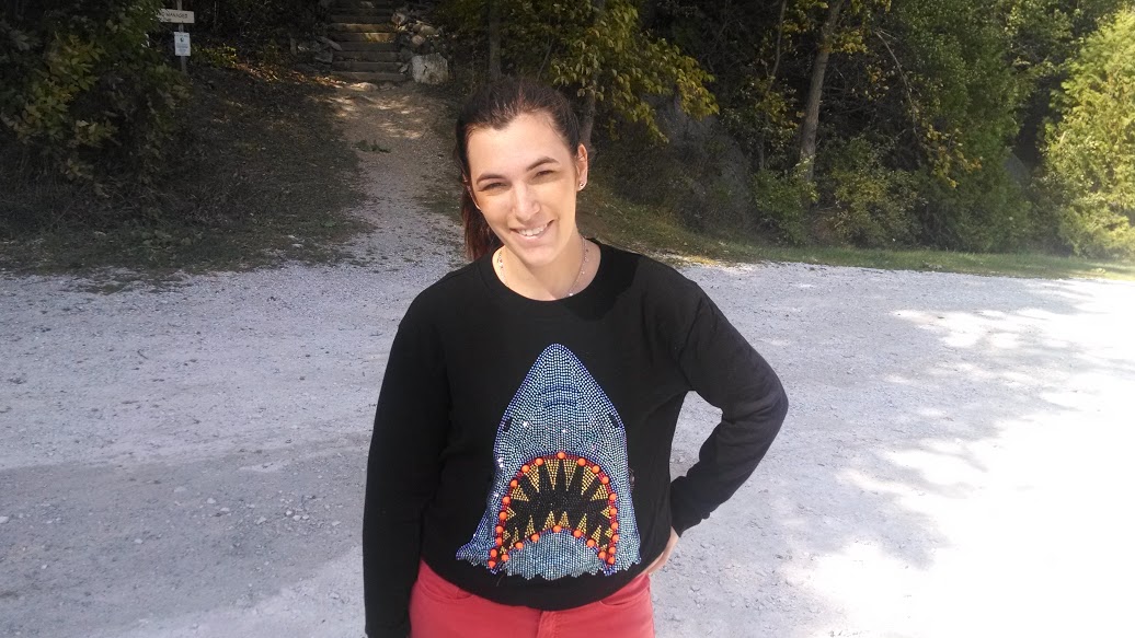 Forever 21 Shark Sweater (Forever21.com), $14.50, BDG pants (Urban Outfitters on sale, Burlington) $20.00.