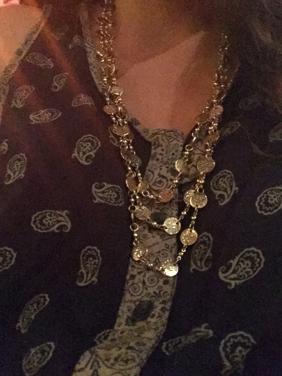 Forever21 Paisley Romper (forever21.com), $23.00, Forever21 Layered Necklace (forever21.com), $10.00, Gold Tano Bag (gifted)